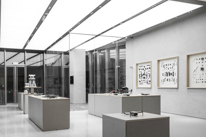 店铺首层陈列着御 Mavic系列、灵眸 Osmo系列以及机甲大师 RoboMaster等消费级产品,相应的配件和附属设备一应俱全。店铺二层则主要陈列如影 Ronin系列、悟 Inspire系列、经纬 Matrices系列等专业级、行业级产品,并另辟空间作为分享会场地,供各类活动使用。