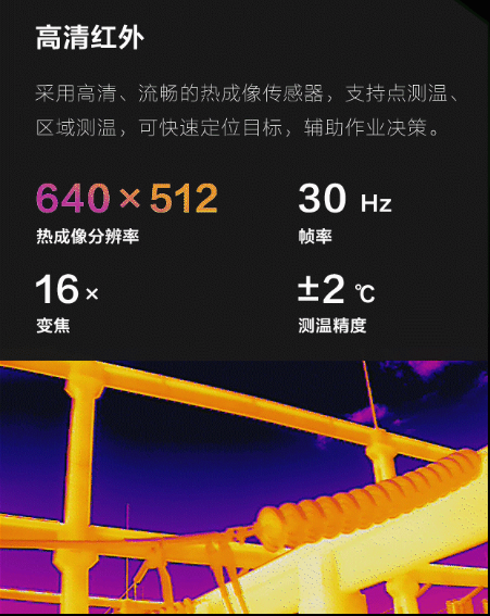高清红外:“御” 2 行业进阶版采用了高清、流畅的热成像传感器,支持点测温、区域测温,可快速定位目标,辅助作业决策。